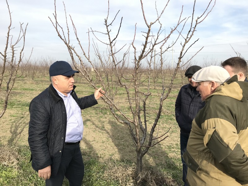 Следующим объектом посещения стал КФХ «Д.И. Орусханова». Глава хозяйства Садулла Орусханов ознакомил с интенсивным садом на площади 20 гектаров, плодоношение сада планируется в 2021 году. В саду проводилась весенняя обрезка деревьев и мульчирование, включающее в себя измельчение растительных остатков (веток) и покрытие ими междурядий. Также в хозяйстве имеются посадки клубники и земляники на площади 2 гектара.